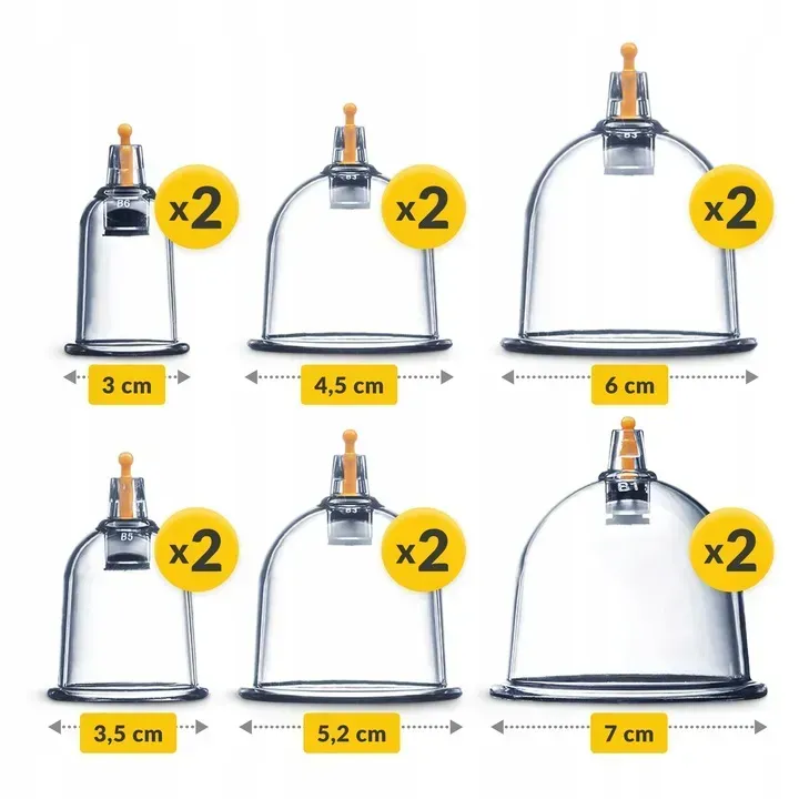 Набір містить банки різних розмірів, що дозволяє легко підібрати відповідний варіант для різних зон тіла. Підходить для домашнього використання, масажних кабінетів, SPA-студій і салонів догляду за тілом.